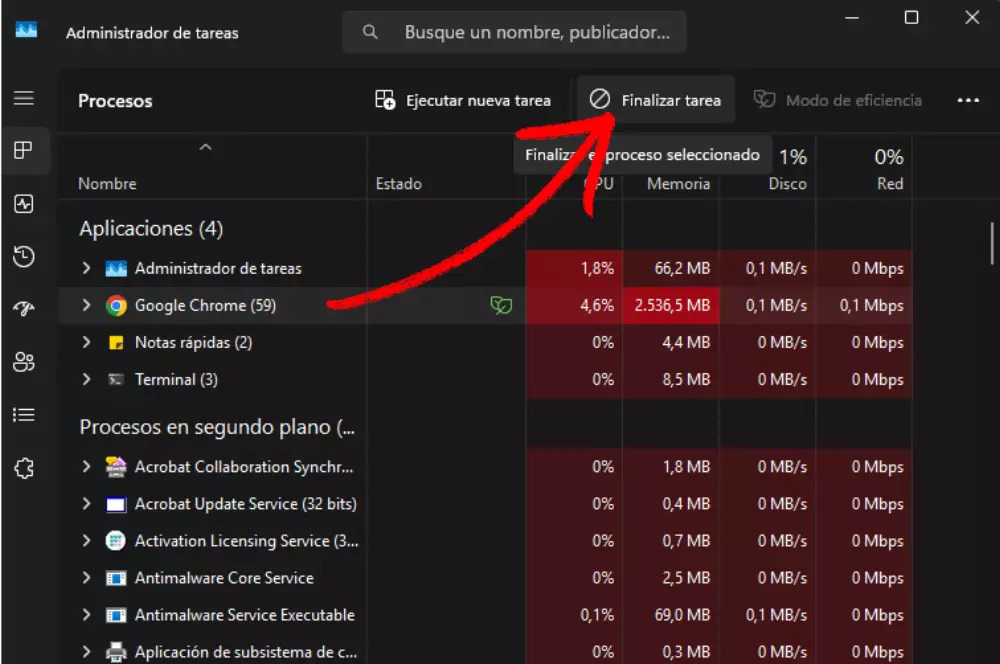 Otra opción es acceder al "Administrador de tareas" de Windows. Puedes hacerlo desde la barra de búsqueda del sistema operativo o dándole a las teclas CTRL + SHIFT + ESC. De esta manera, se abrirá una nueva pestaña con todos los programas abiertos en ese momento. Ahí solo tendrás que pulsar en los programas que quieras cerrar y clicar en «Finalizar tarea». Automáticamente se cerrarán.