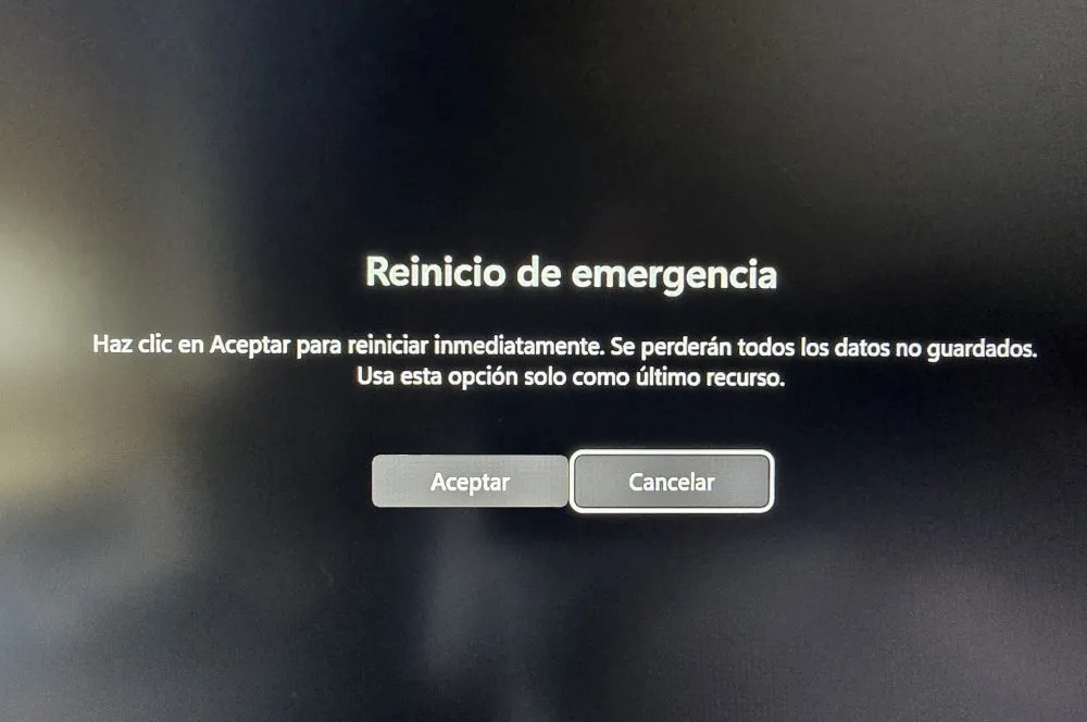 Si no puedes usar con normalidad tus aplicaciones y ni siquiera se te concede el permiso de pulsar sobre el icono de inicio para reiniciar tu dispositivo, lo mejor es que pases a la siguiente fase. En este caso, también tendrás que pulsar sobre el atajo Ctrl + Alt + Supr, pero esta vez deberás mirar abajo a la derecha para localizar el símbolo de encendido o apagado. Primero, mantén la tecla Ctrl pulsada y, sin apartar el dedo, coge el ratón y haz clic en dicho botón para dirigirte a la sección conocida como Reinicio de Emergencia. Selecciona Aceptar para reiniciar el ordenador de forma inmediata.